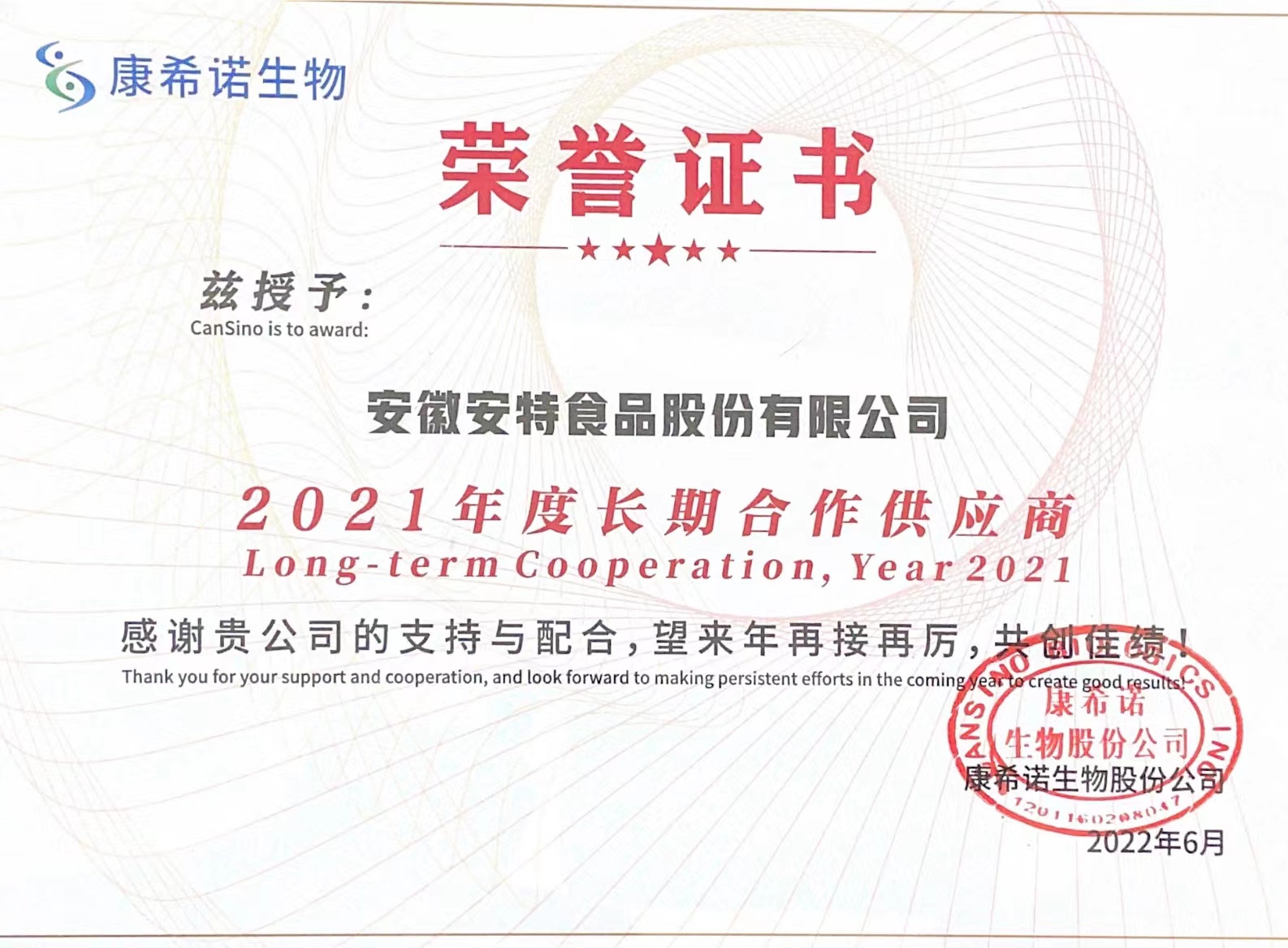 今天,我們收到一份康希諾生物頒發(fā)的榮譽證書,授予我司“2021年付長期合作供應商”榮譽稱號。